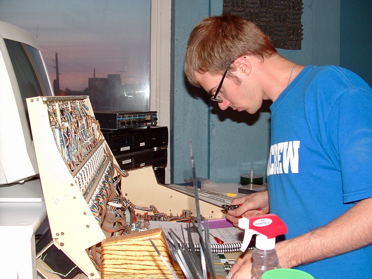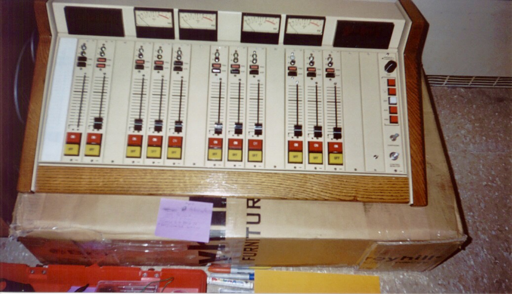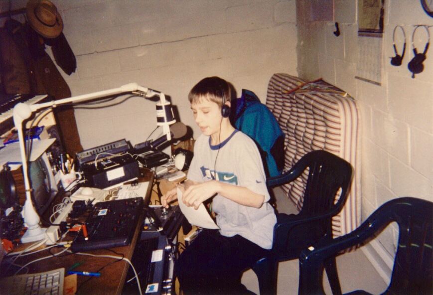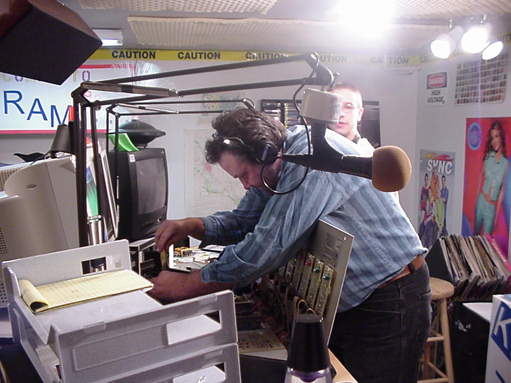 In the summer of 1998 a neighboring town’s radio station was sold and their local studio closed. Joe and Jake had connections and scored several pickup loads of old equipment. Most of the equipment was thought to be nonworking. After laying out and going through the equipment on Josiah’s basketball court, the two started planning what was going to the studio.